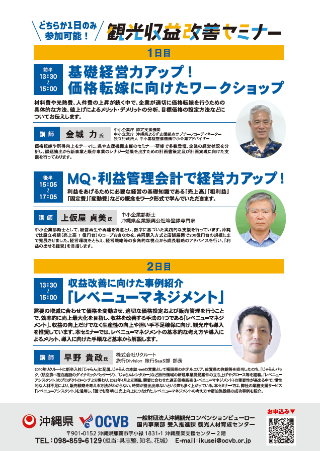 一般財団法人沖縄観光コンベンションビューロー(OCVB)では、沖縄県より観光人材育成・確保促進事業を受託しており、「観光収益改善セミナー~価値に見合った価格設定ができていますか?~」を開催いたします。
