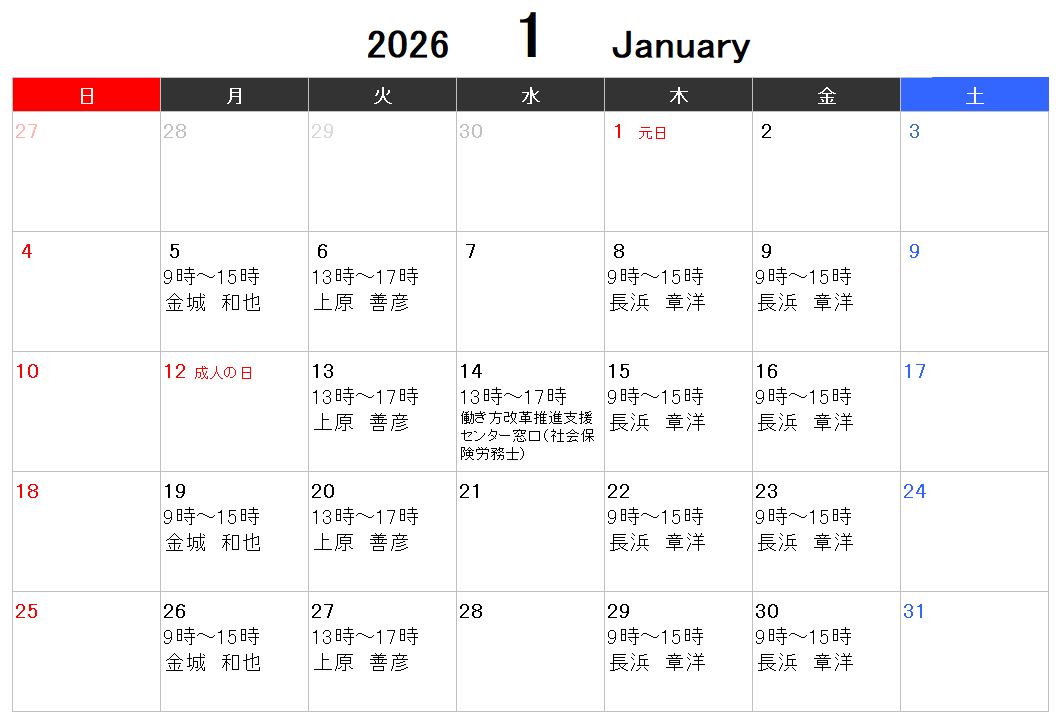 2025.12.26 お知らせ 〈1月の個別経営相談窓口のご案内〉 恩納村商工会では、窓口相談体制充実化のため、専門家相談窓口を週に4回設置しています。事前予約制で、各種経営相談を受け付けておりますので、お気軽にご活用ください。 ・専門家設置日程は都合により変更する事がございます。 ・相談は完全予約制ですので、事前にご予約をお願いします。 予約外でお越しの場合、当日の対応が難しい場合がございます。 予約:098-966-8258 (恩納村商工会)