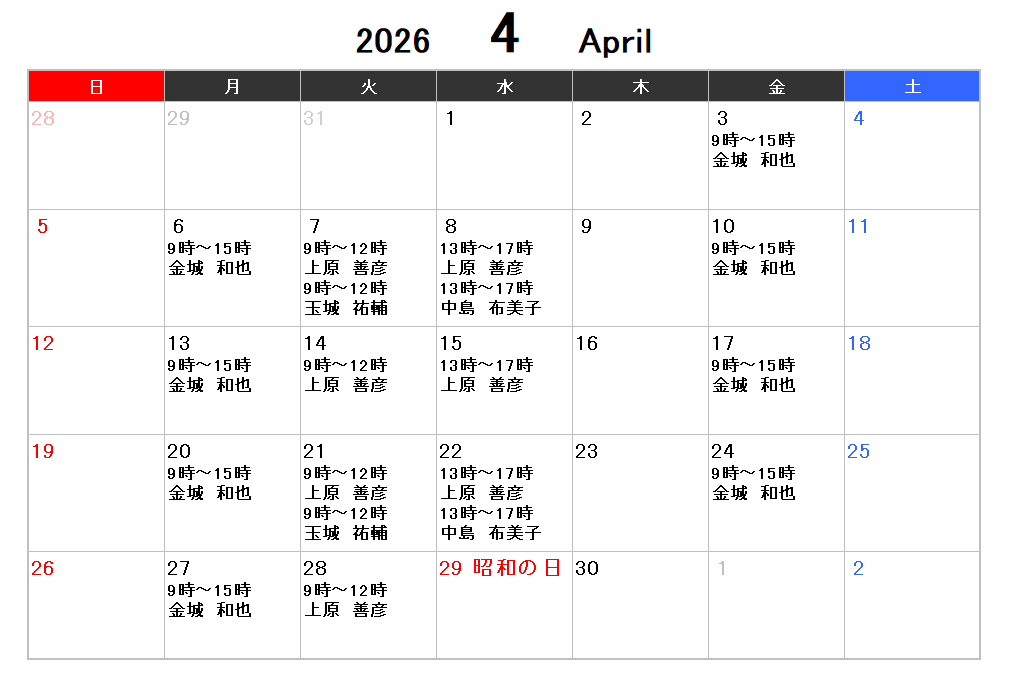 2026.04.03 お知らせ 〈4月の個別経営相談窓口のご案内〉 恩納村商工会では、窓口相談体制充実化のため、専門家相談窓口を設置しています。事前予約制で、各種経営相談を受け付けておりますので、お気軽にご活用ください。 ・専門家設置日程は都合により変更する事がございます。 ・相談は完全予約制ですので、事前にご予約をお願いします。 予約外でお越しの場合、当日の対応が難しい場合がございます。 予約:098-966-8258 (恩納村商工会)